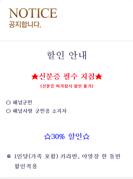 - 해남군민은 30%할인을 더해줍니다. 해남군 두자녀이상 다자녀 가정도 이용료 30% 감면해준답니다. 중복적용이 가능한지 꼭 확인해보시기 바랍니다.
