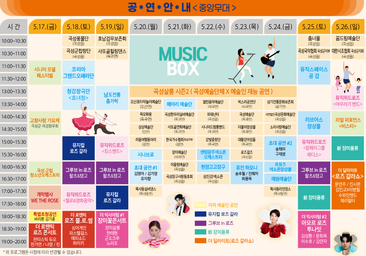 곡성세계장미축제에서는 다양한 이벤트와 공연, 증길거리가 가득합니다. 아래 축제에서 참여할 수 있는 다양한 프로그램 및 체험행사를 확인하시고 참여해보시기 바랍니다.