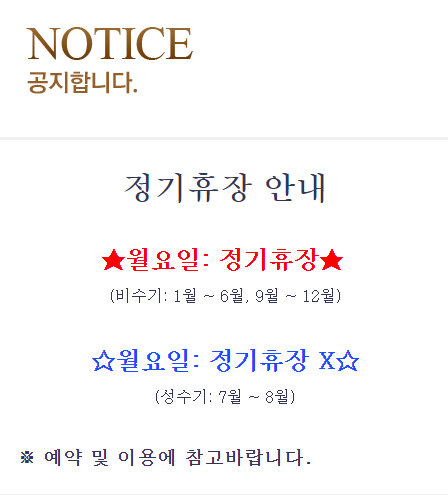 - 월요일은 정기휴장이니 꼭 확인하고 가시기 바랍니다.
