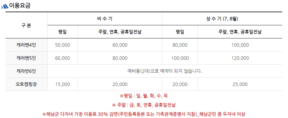 - 해남군민은 30%할인을 더해줍니다. 해남군 두자녀이상 다자녀 가정도 이용료 30% 감면해준답니다. 중복적용이 가능한지 꼭 확인해보시기 바랍니다.
